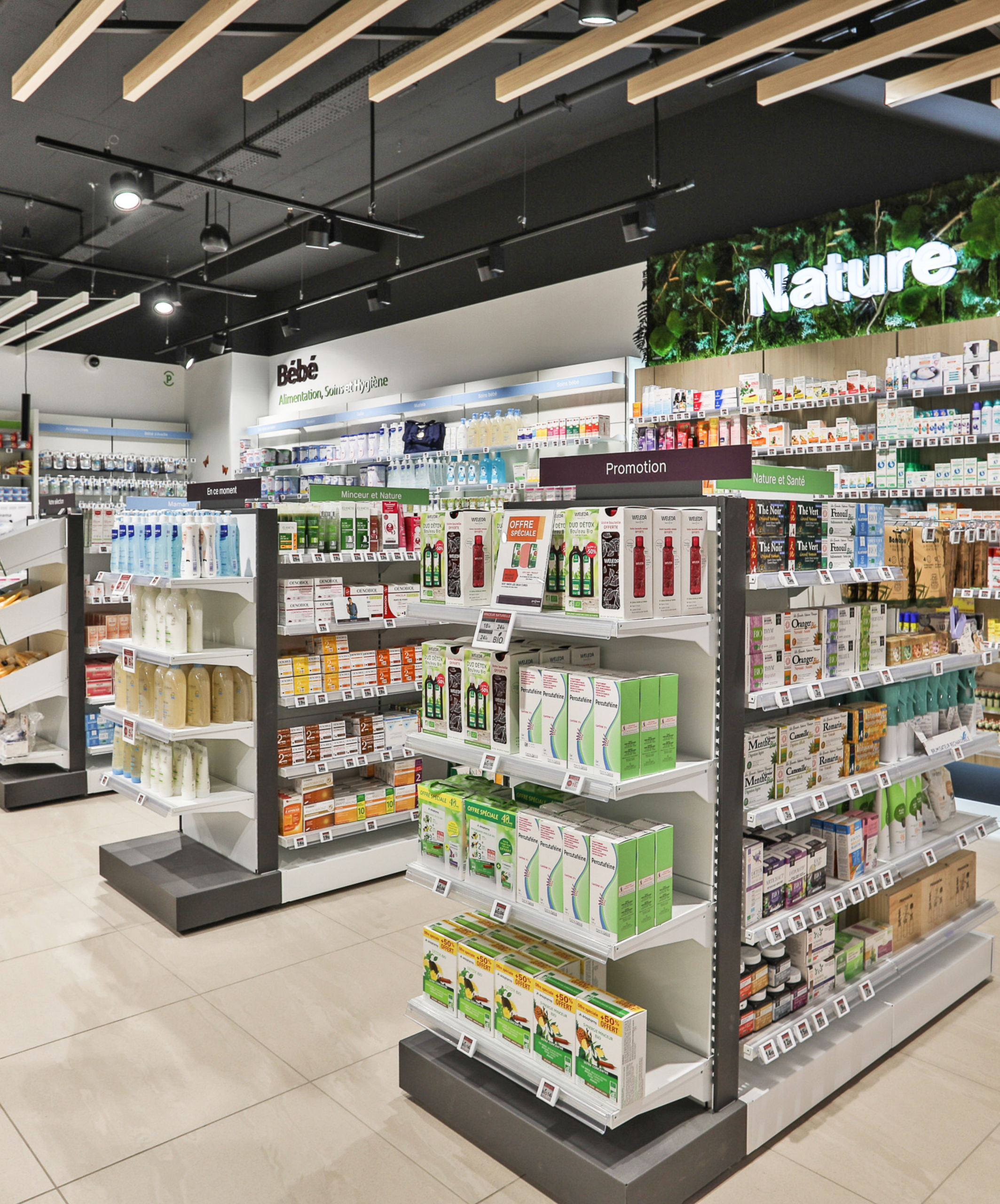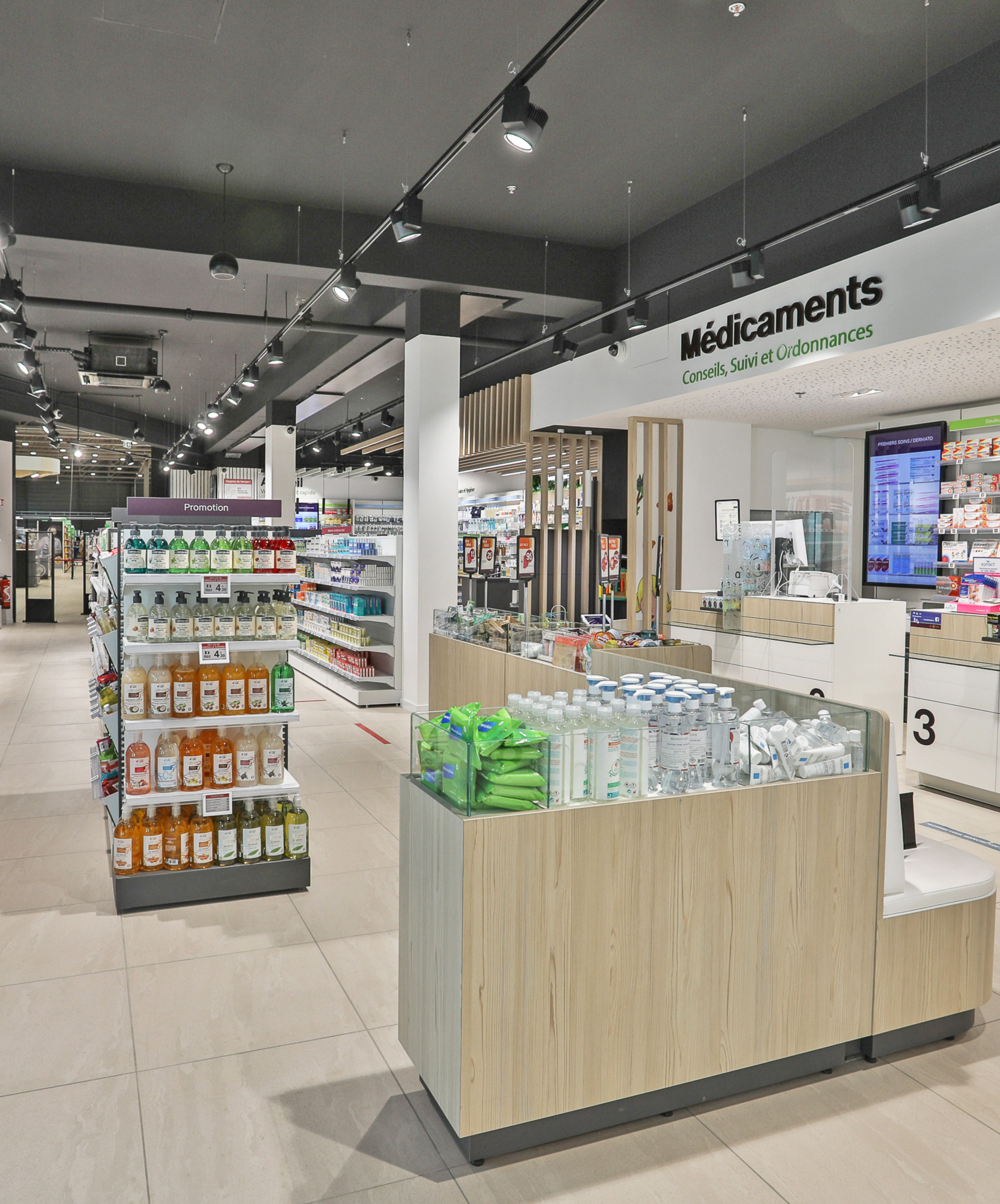 La Pharmacie des Oudairies à La Roche-sur-Yon a profité de son transfert pour repenser entièrement son espace de vente. L’objectif était d’agrandir l’officine, structurer les différents corners et améliorer le parcours client tout en conservant la proximité et la confiance avec la patientèle. Chaque espace a été pensé pour valoriser les expertises pharmaceutiques et offrir une expérience fluide, intuitive et agréable.