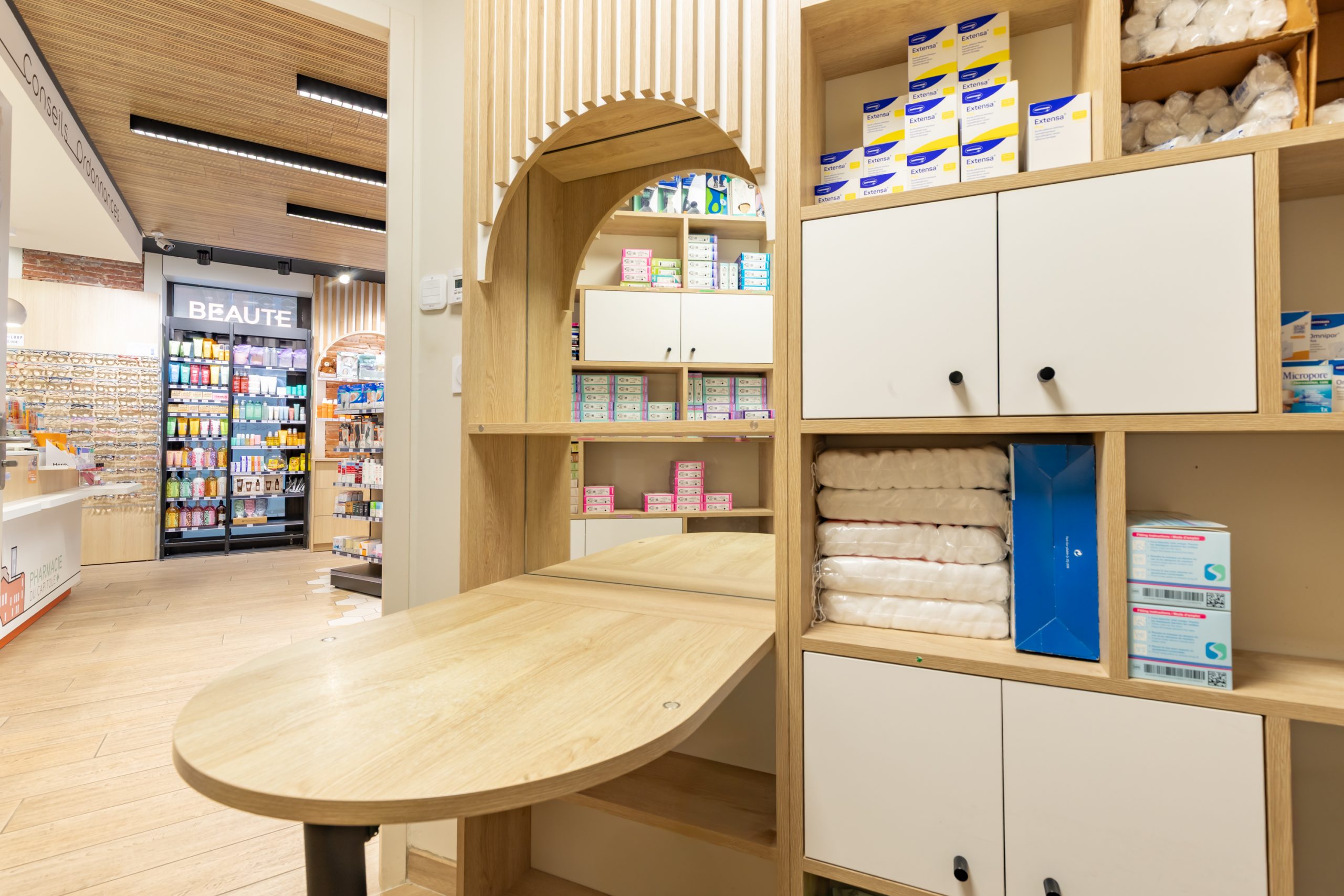 La cabine de confidentialité doit être placée de manière à être visible mais isolée du flux principal. À la Pharmacie du Capitole, l’agencement sur-mesure a permis d’intégrer cet espace dédié aux nouvelles missions du pharmacien (vaccination, entretiens), garantissant la discrétion nécessaire même dans un environnement à forte fréquentation.