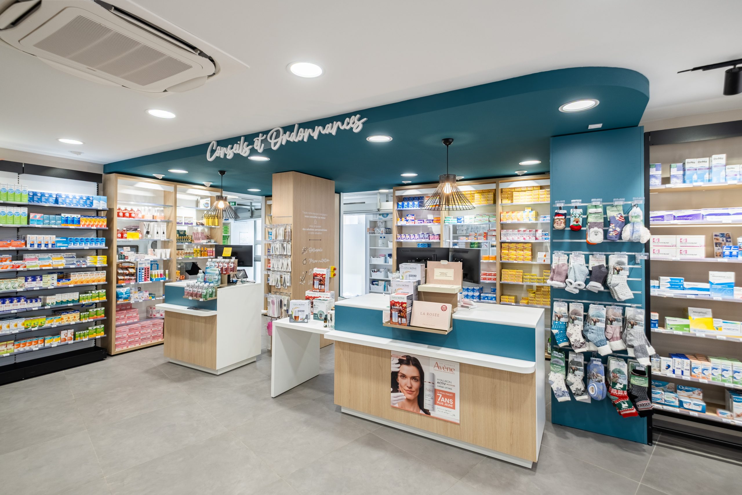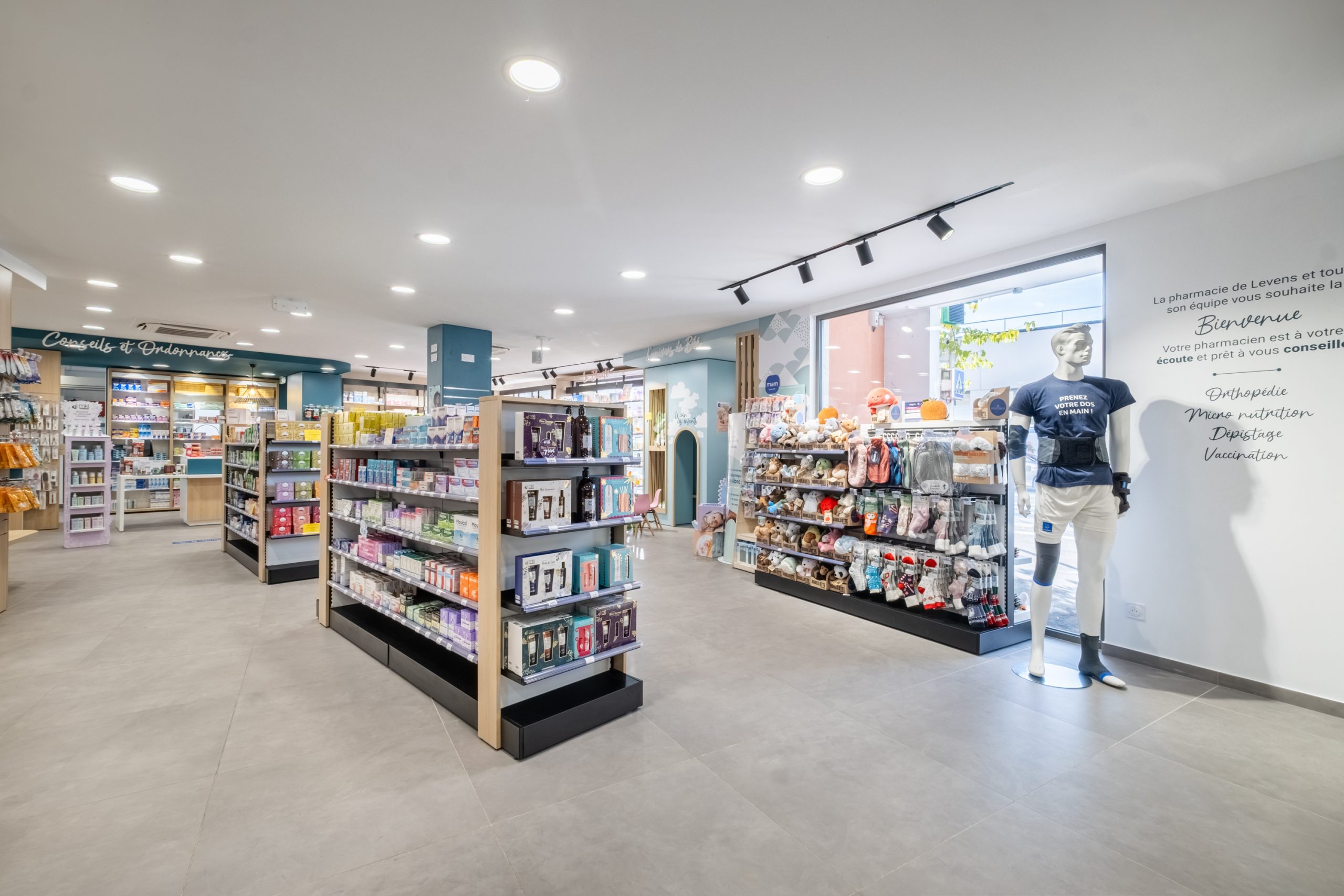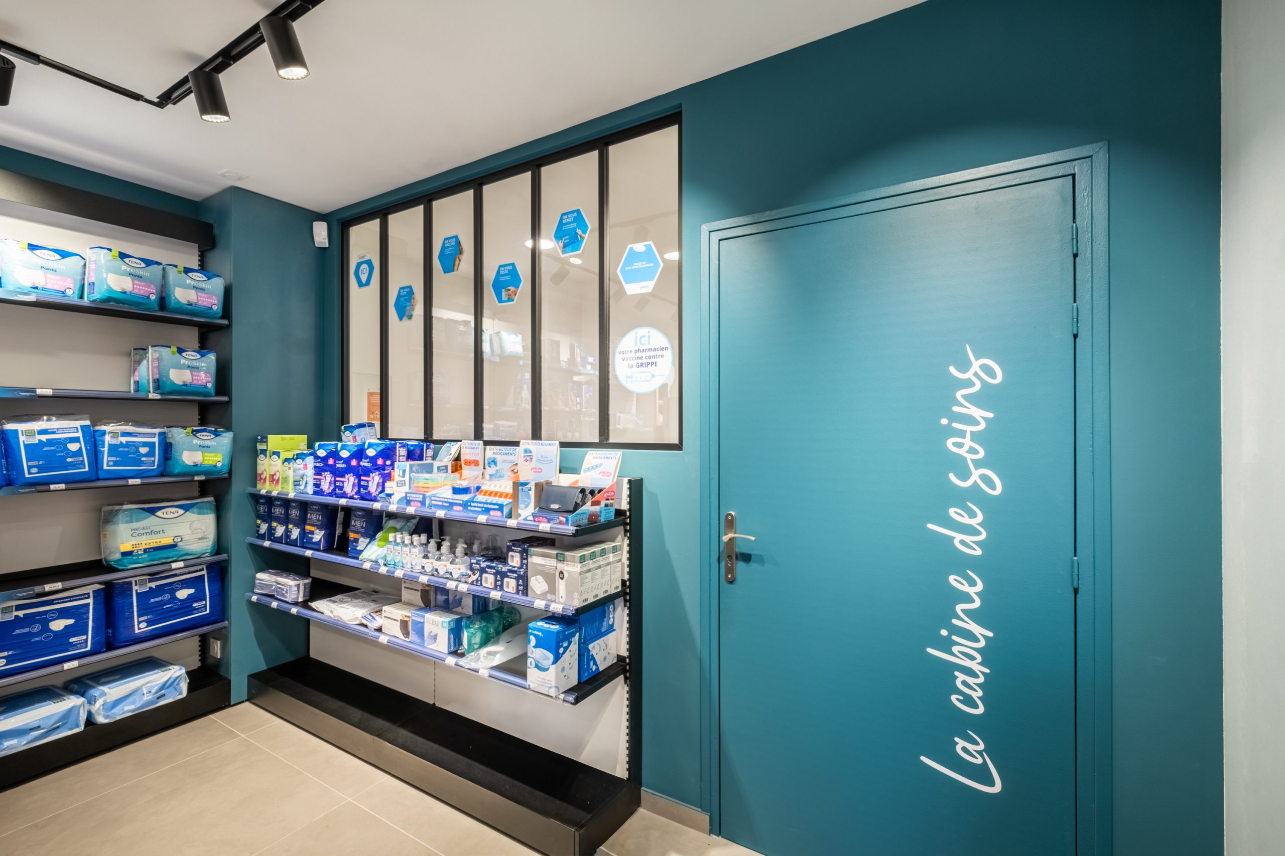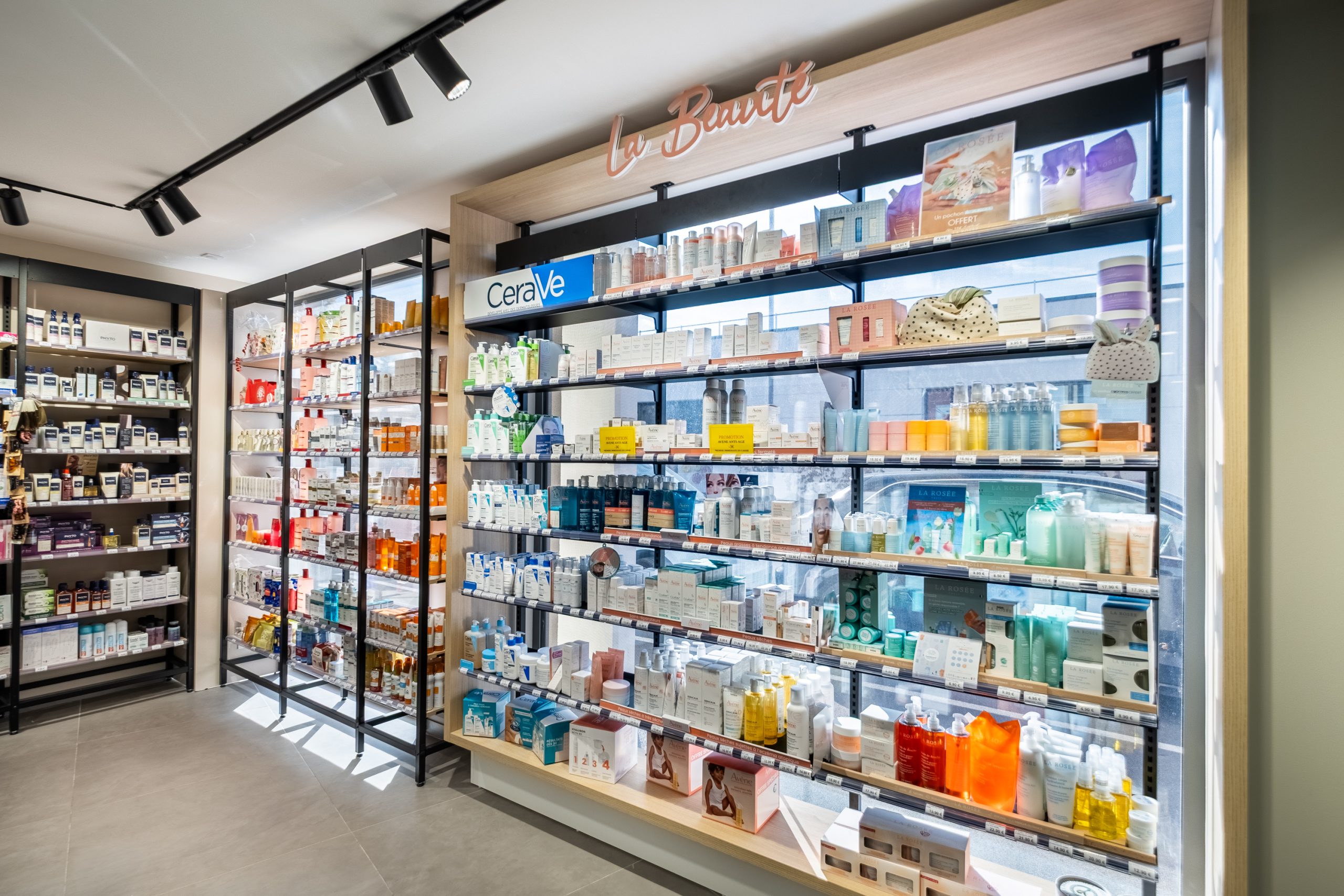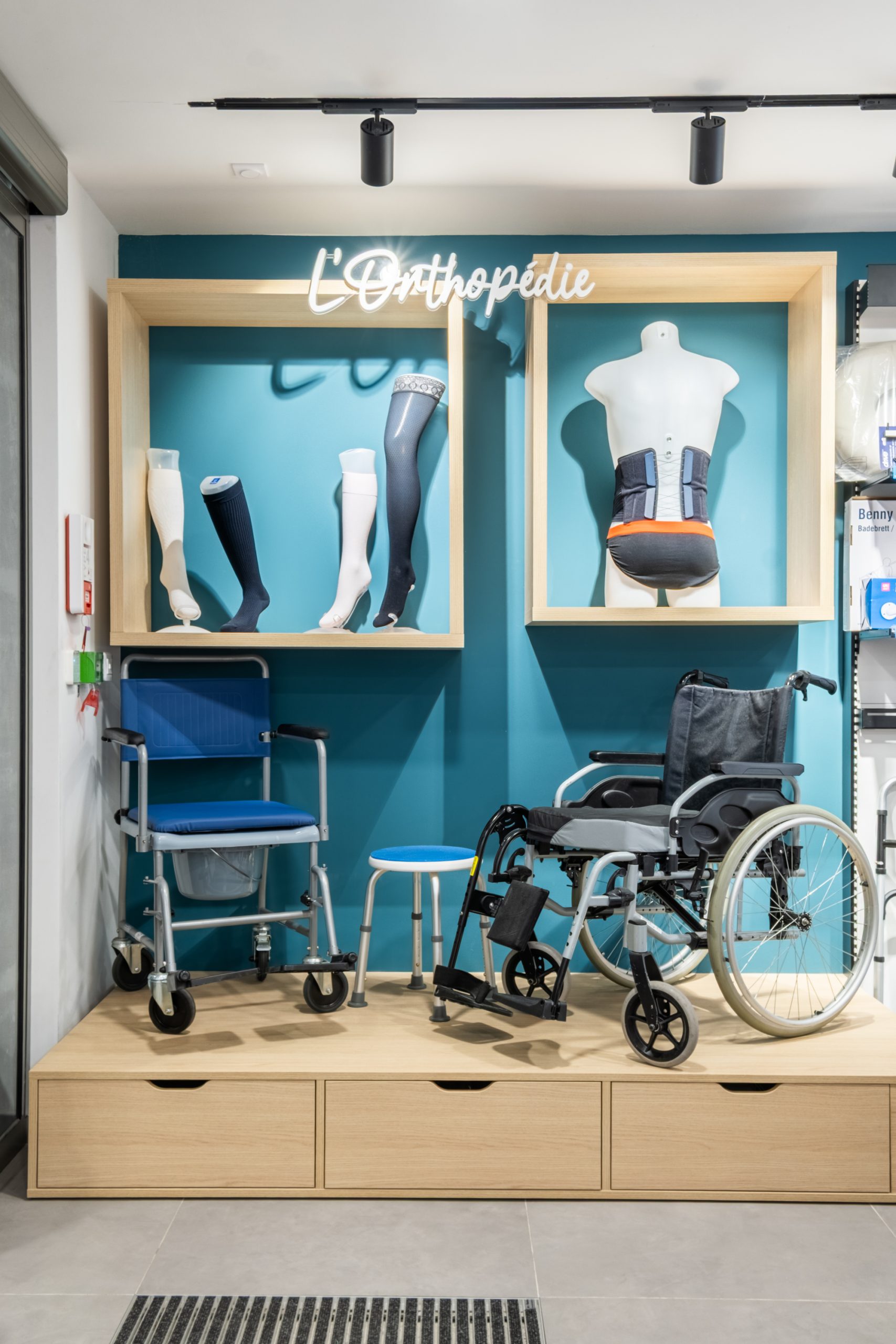 - Positionnement santé à l’entrée de la pharmacie avec espace orthopédie, MAD et cabines.