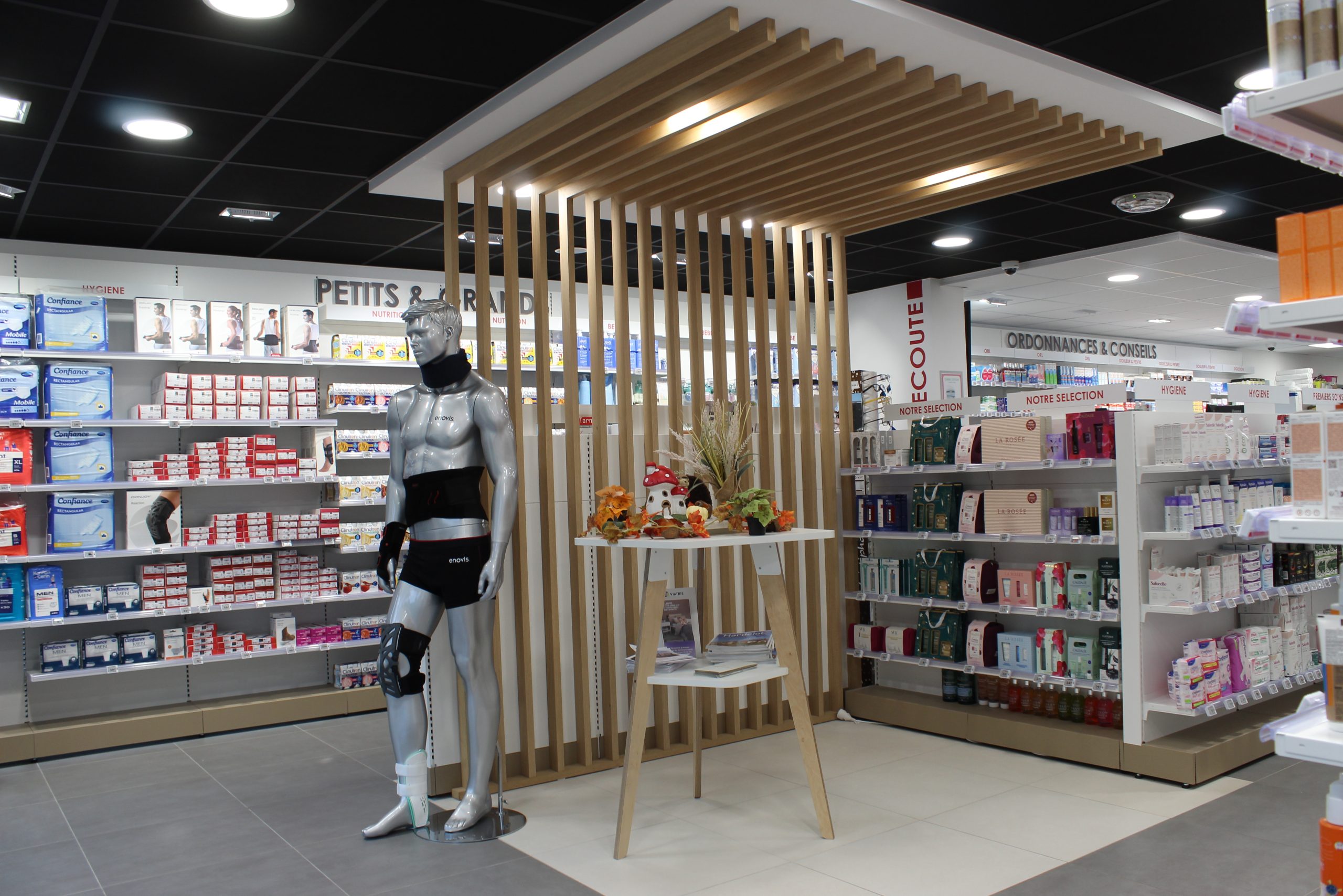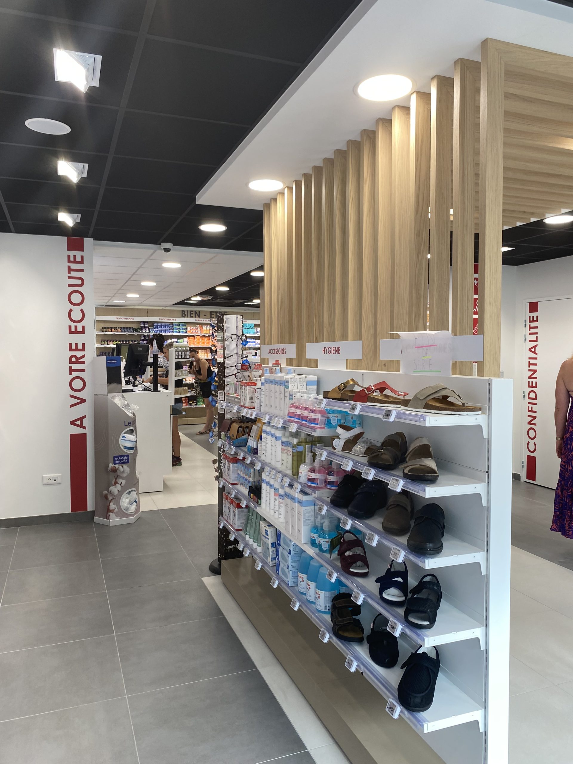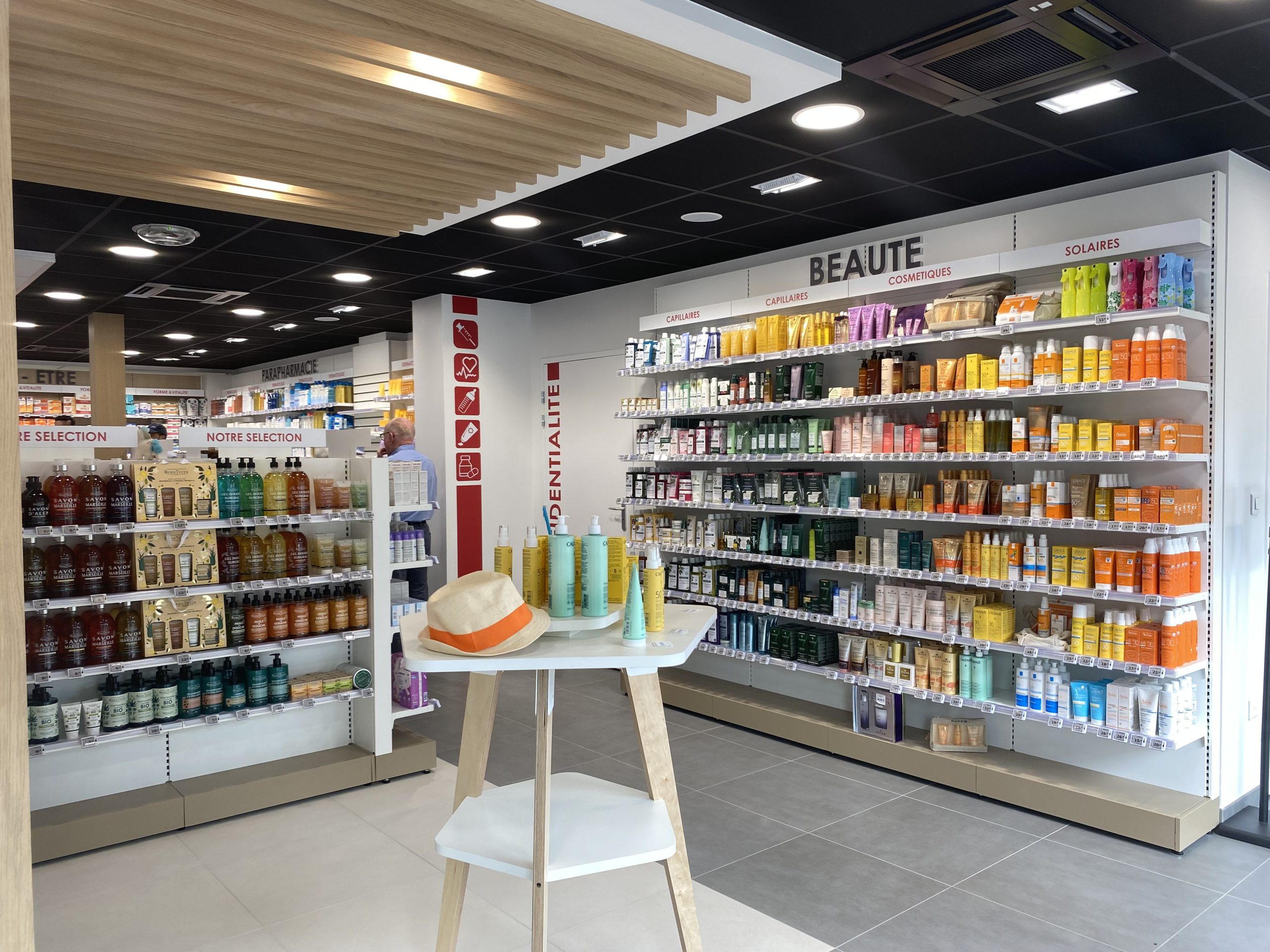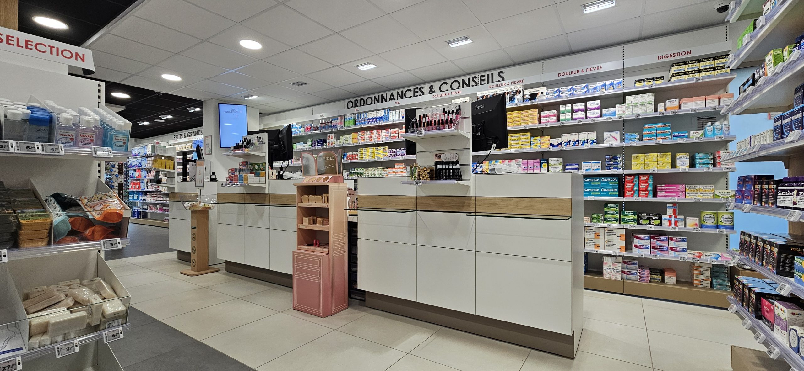 La pharmacie Louchet a été transférée au rez-de-chaussée d’un immeuble neuf. Conçue de manière moderne et fonctionnelle, elle offre un parcours client fluide. Le pharmacien dispose de deux cabines pour accueillir au mieux sa patientèle. Ce projet a réussi à allier optimisation des espaces et efficacité.