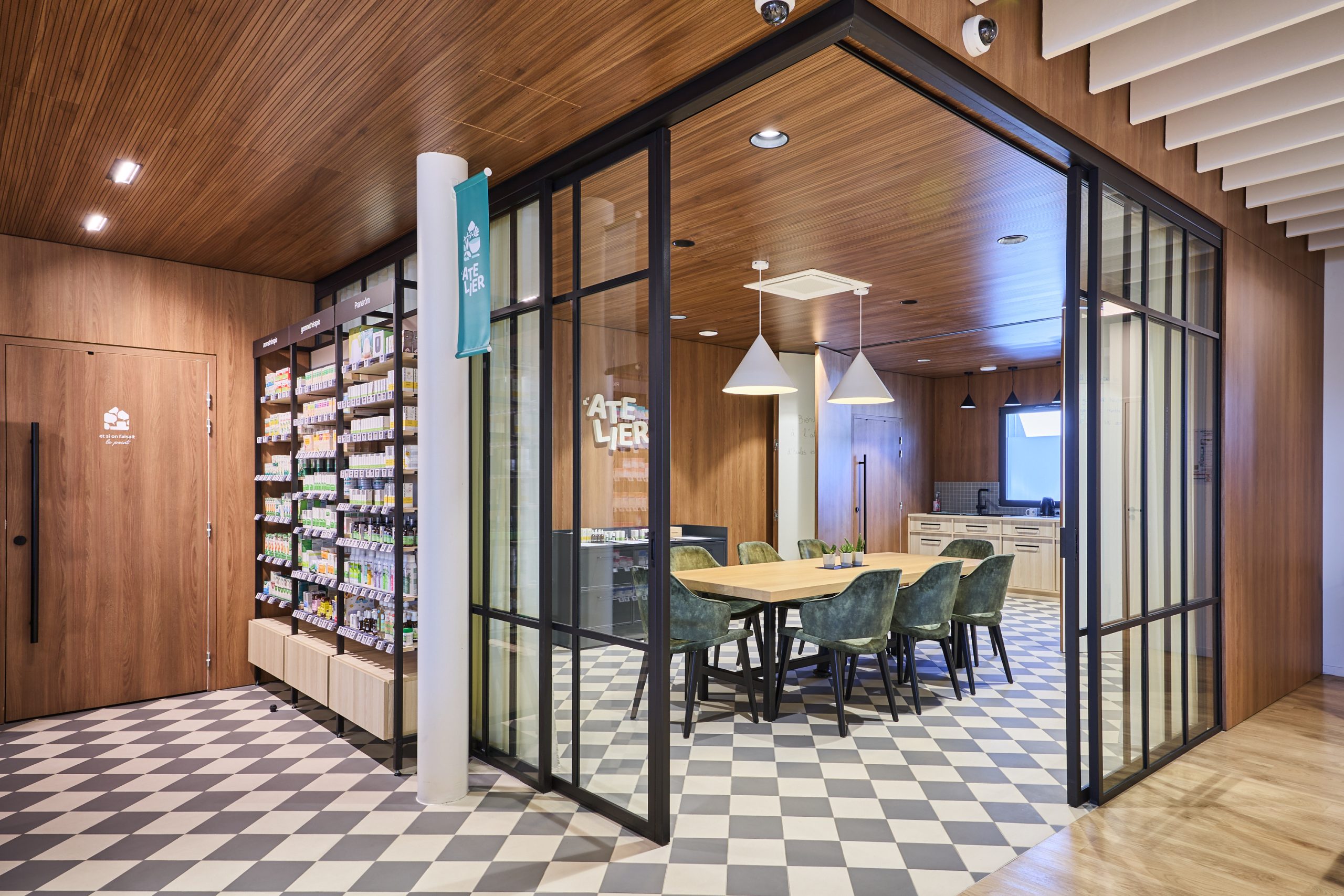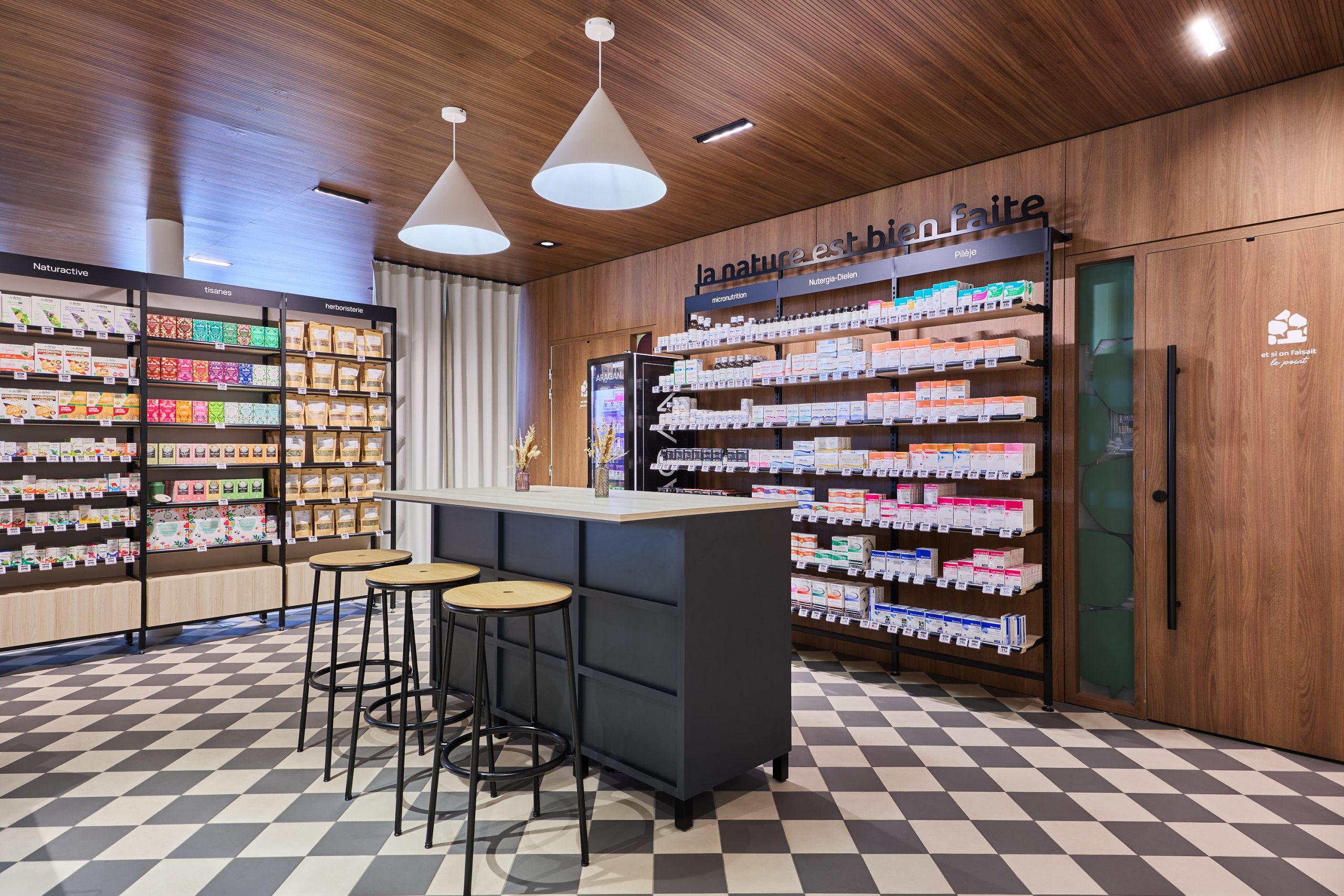 - Conception d’un atelier polyvalent ouvert sur l’espace de vente et pensé à la fois pour l’équipe (réunions, séminaires, déjeuners) et pour le public (séances d’aromathérapie, de nutrition, de sophrologie…).